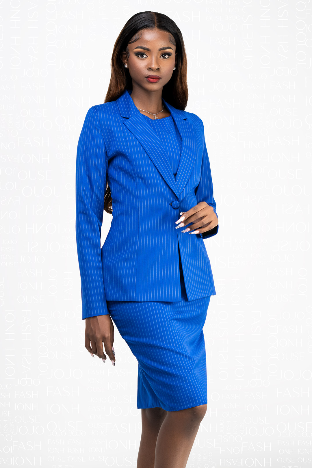It features a fitted dress with a back slit for a modern touch, perfectly complementing the cropped blazer with two decorative chest buttons.